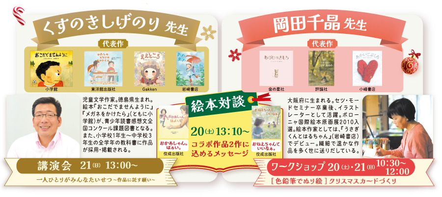 | 10:30 〜 12:00 | 「クリスマス風デザインカードに 色鉛筆でぬり絵」 講師:岡田千晶先生 会場:ワークショップA&B 所要時間:15分~20分 定員:30人/回×3回 参加費:無料 ※【当日受付にて先着順】 |